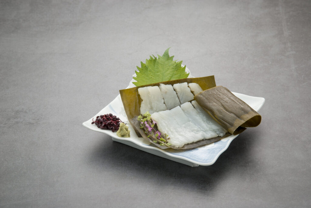 昆布〆は富山の郷土料理で、食材を昆布で挟み1日程度置いたもの、刺身を昆布〆にすると刺身の水分が昆布に吸われて身が締まり、昆布の旨味が刺身に移り味わい深くなります。