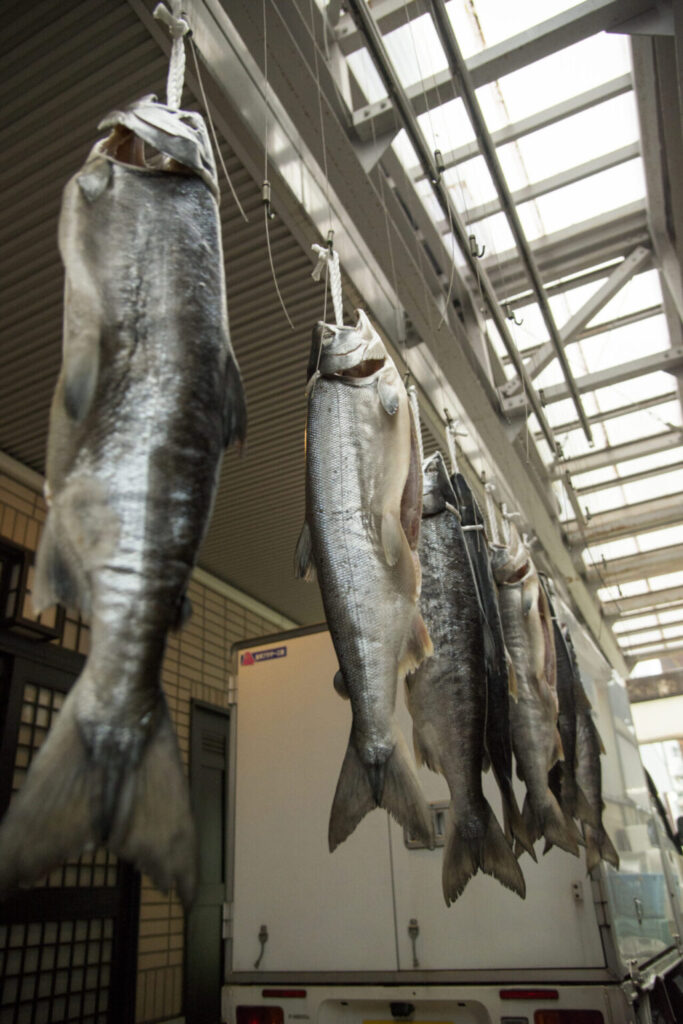 北海道産の秋鮭の塩漬(山漬)を店主が代々受け継いできたやり方で塩抜きし、魚体をていねいに洗ってつるし寒風にさらし身を本格熟成させます。